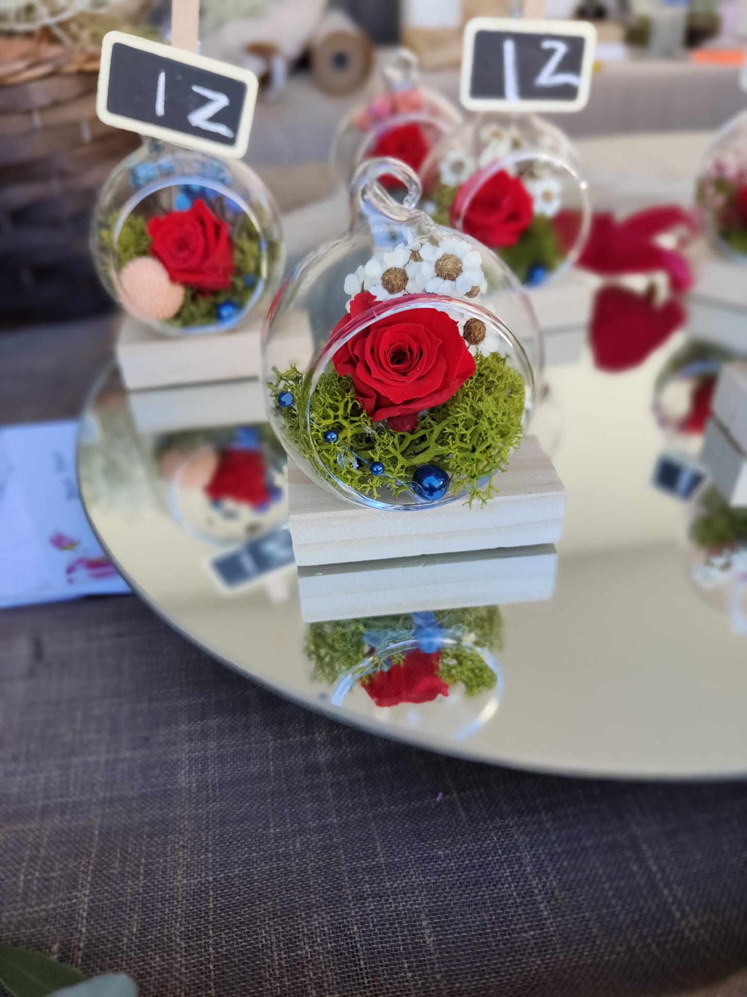 Una bola pequeña de cristal con una flor preservada es un objeto decorativo delicado y hermoso que encapsula una flor real tratada para conservar su aspecto fresco y vibrante durante mucho tiempo.